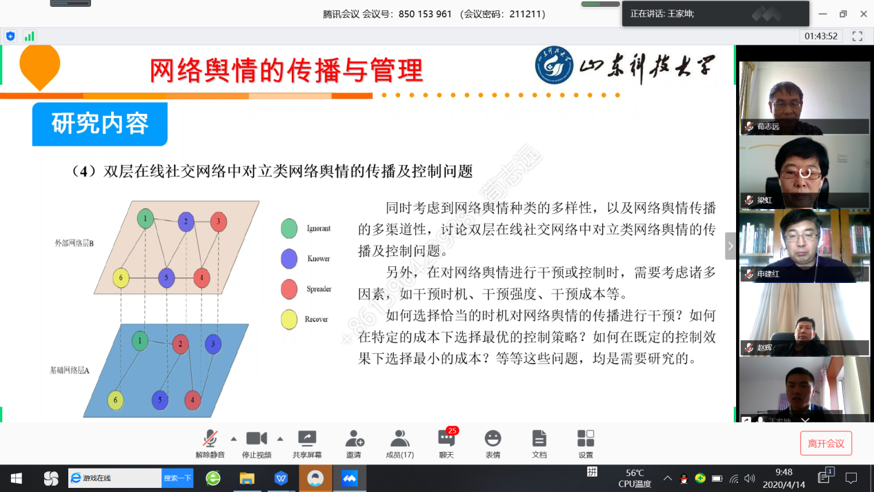 4月14日上午,3044永利集团官网举行疫情防控期间公开招聘博士首次线上试讲,试讲由3044永利集团官网院长荀志远主持,党总支书记梁虹、院学术委员会主任陈艳、教务处郭树峰、人事处董雷只、副院长申建红、赵辉、董德坤及各学科及专业负责人等参加。评委们通过非现场接触方式的腾讯会议在各自的办公室收看了来自加拿大阿尔伯特大学、厦门大学、华南理工大学等高校的4位博士的PPT课程讲授、科研成果及个人未来科研规划介绍等,并在线提问答辩和师德考核。试讲完成后,按照要求评委们从思政品德、教学技能、学术研究等方面对应聘博士进行了打分。