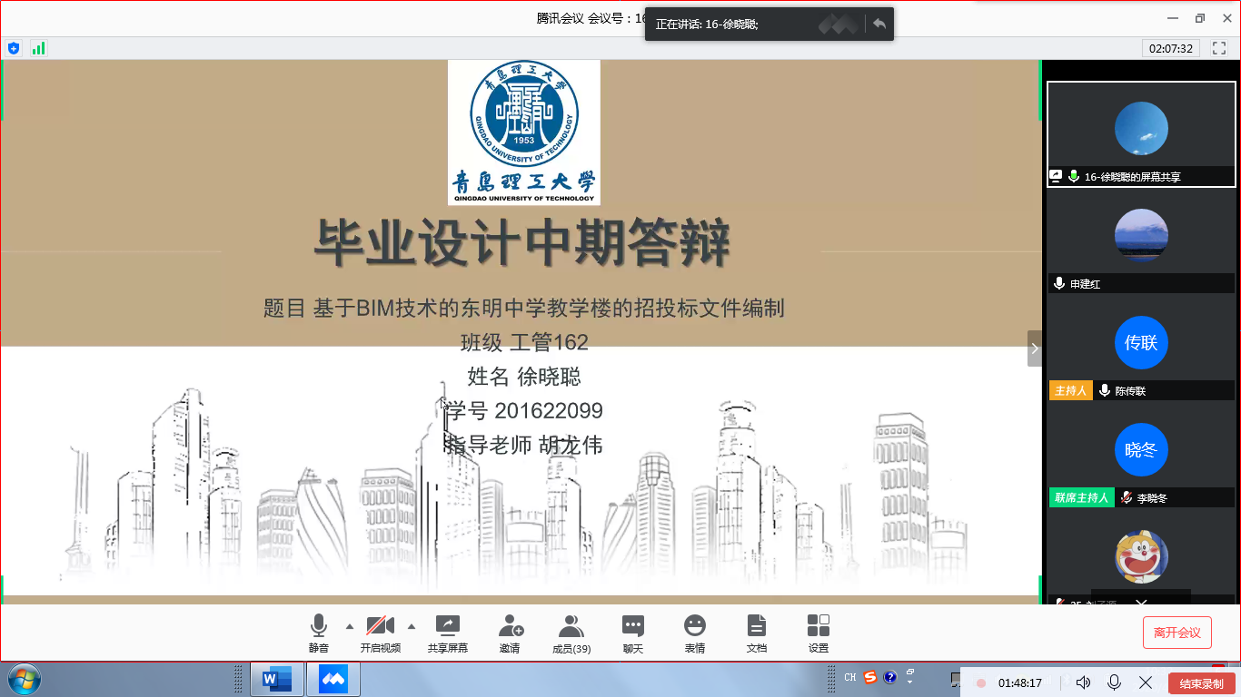 本次中期答辩采取和毕业答辩相同的流程分三个小组进行,学生和指导教师互相回避,使用腾讯会议在线答辩。每位毕业生首先向答辩老师介绍毕业设计选取的项目概况、展示工程图纸、手算工程量初稿、BIM5D建模等情况,分析下一步工作思路、计划及资料预备情况。答辩委员根据学生汇报情况指出设计思路、进度控制方面的问题,并与每位毕业生互动沟通,了解设计实施中的困难、考研就业状况,并提出具体的建议。在线答辩结束后,答辩委员通过集体商议,给出每位学生的成绩评定与问题建议,汇总至教研室并分别反馈给每位设计(论文)指导教师。整个在线答辩过程紧凑有序,师生着装得体,精神专注,声音洪亮,中期答辩取得了很好的预期效果。