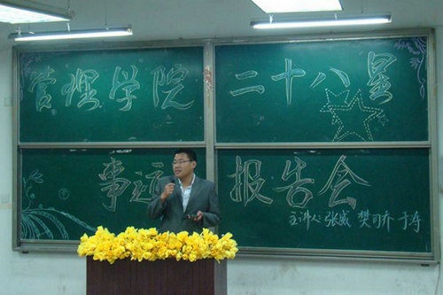 5月15日晚,管理学院在二教阶401举行了“管理学院二十八星优秀事迹报告会”。本次报告会由管院二十八星之“院会之星”——曾任管理学院学生会主席、成功保研的张威同学,“创新之星”——曾获全国数学建模大赛国家一等奖、山东省十大优秀学生提名奖、保研至哈尔滨工业大学的樊司乔同学,“考研之星”——考取同济大学研究生、在校期间获得双学位的于涛同学为低年级学生做了精彩的报告。