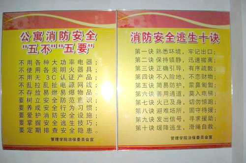 根据《青岛理工大学关于做好冬季防火工作的通知》精神,为进一步普及大学生的消防安全知识,增强消防安全防范意识,促进“平安校园、和谐校园”建设,日前,管理学院治保会统一制作了“公寓消防安全五不、五要”和“消防安全逃生十诀”等安全知识宣传展板、并张贴于学生公寓,让安全常识走进同学们的生活中。