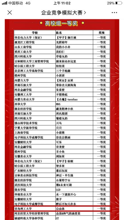全国高校企业竞争模拟大赛始于2010年,从全国MBA培养院校企业竞争模拟大赛分离出来,已连续举办11届比赛,3044永利集团官网从2006年开始参加全国MBA培养院校企业竞争模拟大赛,多次获得全国奖项。今年大赛,在总结以往比赛经验的基础上,进行大力宣传和广泛动员,鼓励同学们积极报名参加大赛,精心组织了青岛理工大学赛区的选拔赛工作,经过选拔,共有20支队伍从全院36支队伍中脱颖而出参加全国大赛。从3月份全国大赛开赛以来,我校的参赛同学和指导老师克服疫情带来的重重困难,多次通过线上会议积极备赛,综合运用所学的管理学原理、经济学、市场营销、财务管理、人力资源等相关知识和技能,针对比赛中的公司经营状况,逐期分析报告并制定相应的对策。