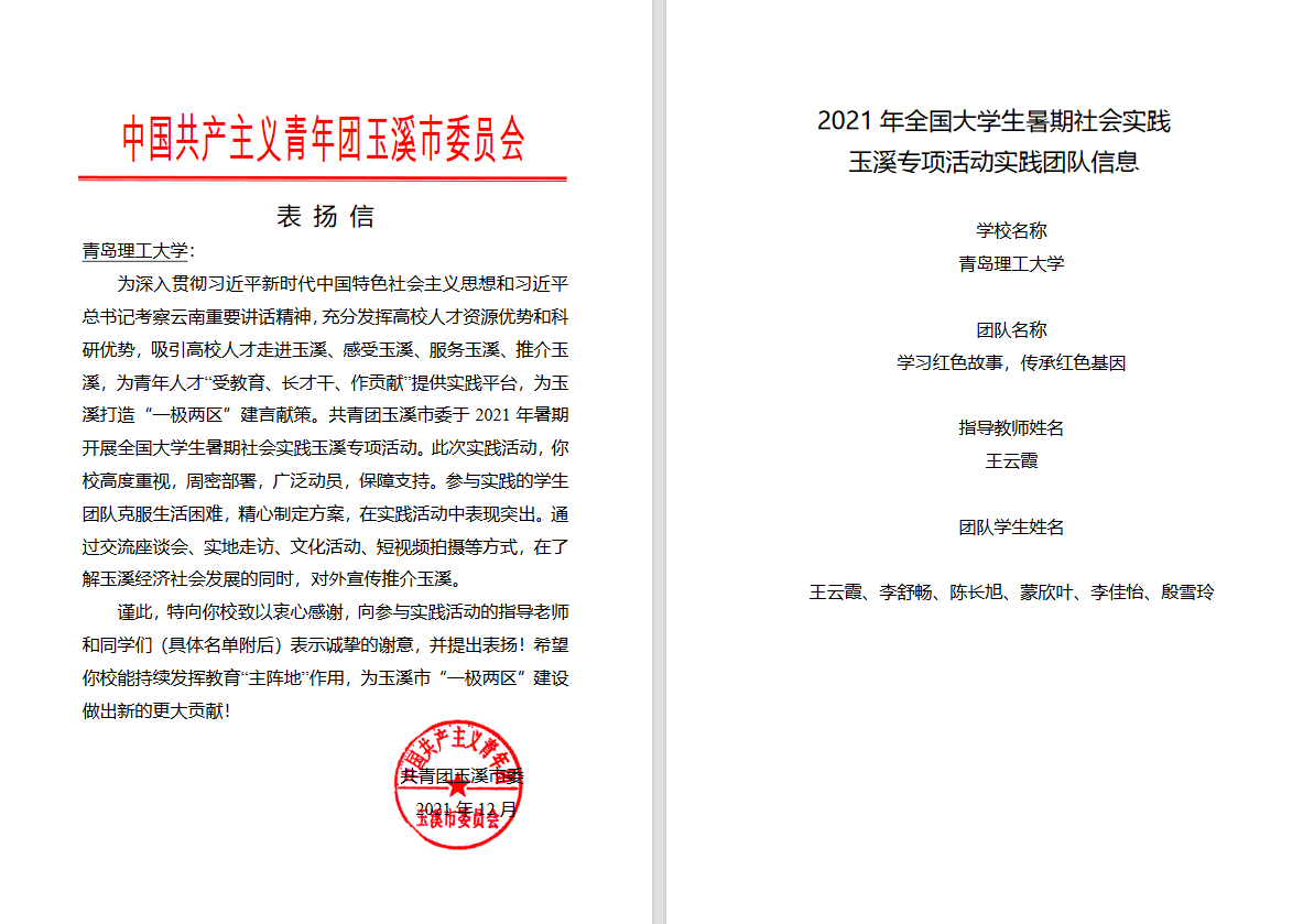 近日,3044永利集团官网收到了来自共青团玉溪市委的两封表扬信。对在2021年全国大学生暑期社会实践玉溪国家级专项实践活动中学院赴玉溪市两支暑期实践团队——学习红色故事,传承红色基因团队(指导教师:王云霞,队员:李舒畅、陈长旭、蒙欣叶、李佳怡、殷雪玲)和青岛理工大学暑期社会实践团队(指导教师:张翔;队员:王淑腾、陈严、余克兴、张克璐)进行表扬和感谢,信中高度评价两支暑期社会实践团队在了解玉溪经济社会发展的同时,积极对外宣传推介玉溪,为“一极两区”建设所做出的贡献。