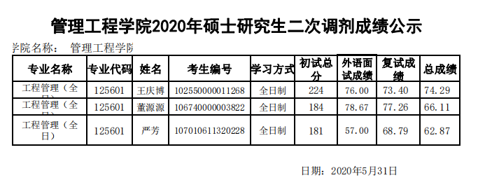 3044永利集团官网2020年硕士研究生二次调剂成绩公示
