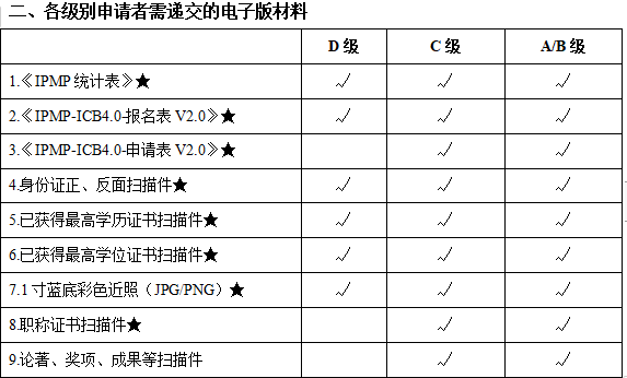需要申请IPMP A、B、C、D级别的学生需满足如下认证条件: