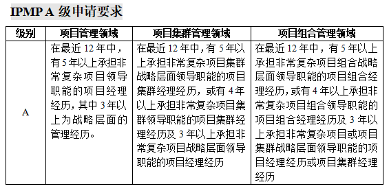 1、IPMP A级(Level A)证书分为三个领域,分别为认证的国际特级项目经理(Certified Project Director)、认证的国际特级项目集群经理(Certified Programme Director)和认证的国际特级项目组合经理(Certified Portfolio Director) ,获得这一级认证的项目管理人员具有领导一个大型组织的所有项目的项目管理能力,或者具有负责大型项目包含的所有项目的能力与资质。符合下列条件可以申请IPMP A级: