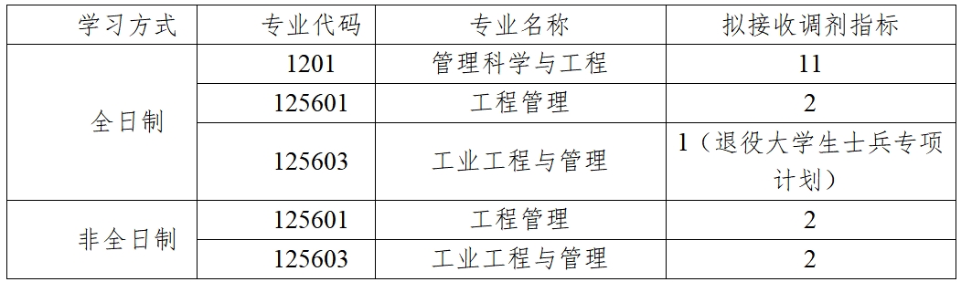 (五)第一志愿报考专业为管理科学与工程(1201)、技术经济及管理(120204)、 土地资源管理(120405)、情报学(120502)的考生,可申请调剂到管理科学与工程专业,报考其他专业的考生不可申请调剂。