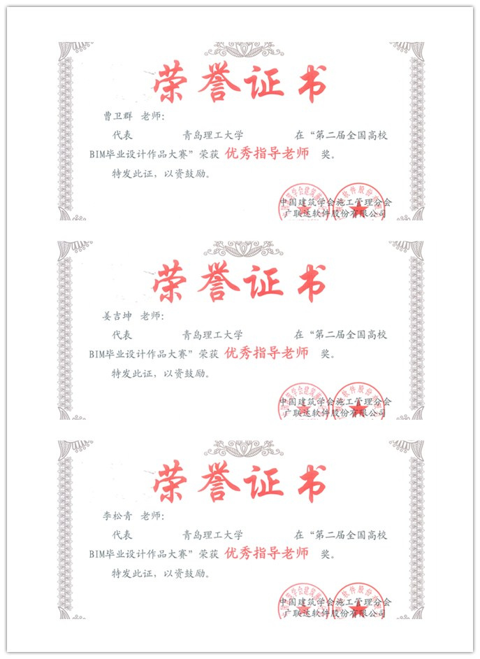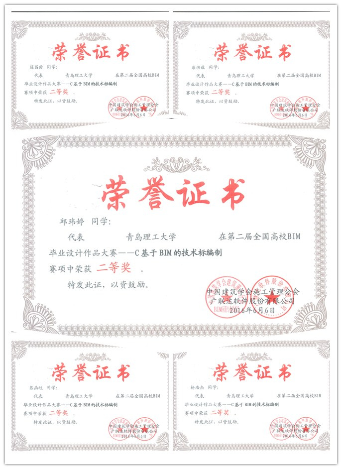 管理学院领导高度重视,精心组织,依托工程管理、工程造价省级品牌、特色专业,从师资、资金、技术等方面提供全方位服务与支持。从2016年1月份全国大赛开赛以来,参赛同学和指导老师付出了巨大努力。在专业教师的精心指导、学生的热情参与、团队成员团结协作和精心准备下,我院工程管理专业“恒韧”团队(指导教师王志强、胡龙伟)在提交的作品和现场答辩环节获得了评委组的高度认可,荣获团队特等奖,并获得广联达BIM5D软件应用技能认证证书;国际工程项目管理专业“飞-跃-队”(指导教师姜吉坤、曹卫群)、工程造价专业参赛队伍(指导教师李松青)分获C模块二等奖、B模块三等奖。