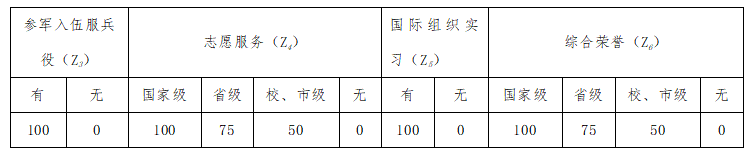 指标包含:科研论文(Z1);科研竞赛(Z2);学生参军入伍服兵役(Z3);参加志愿服务(Z4);到国际组织实习等社会服务(Z5);综合荣誉等其他(Z6)6大类。综合能力成绩=∑(Zi成绩*Zi权重)