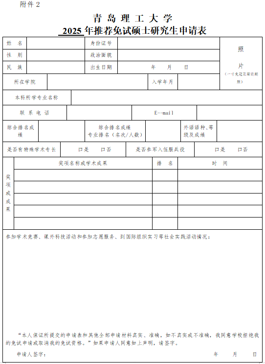 附件2:青岛理工大学推荐免试硕士研究生申请表