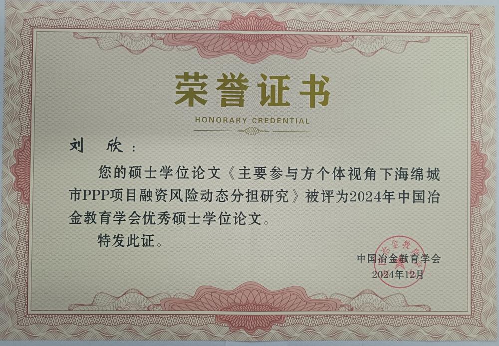 近日,中国冶金教育学会公布2024年优秀学位论文评选结果,我院2022届硕士生刘欣的学位论文《主要参与方个体视角下海绵城市PPP项目融资风险动态分担研究》获评“中国冶金教育学会优秀硕士学位论文”,指导教师为赵辉教授。